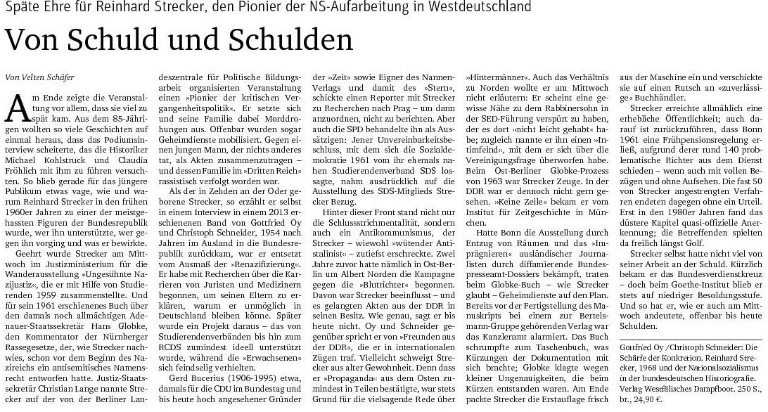 Von Schuld und Schulden. Späte Ehre für Reinhard Strecker, den Pionier für