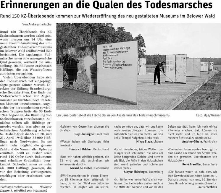Am 15.04.2010 erschien in der Zeitung “Neues Deutschland” .der unten abgebildete Artikel. Bei der Wiedereröffnung des neu gestalteten Todesmarsch-Museums wurden Schautafeln gezeigt, auf denen Erinnerungen von KZ-Häftlingen aus verschiedenen Ländern an den Todesmarsch dargestellt waren. Zu diesen Erinnerungen gehörte auch eine kurze Passage aus dem Buch “Bestien in Menschengestalt” von Mikas Šlaža.